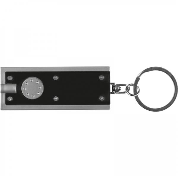 Płaski, plastikowy brelok z wbudowaną latarką LED o białym świetle, na metalowym kółku. Produkt zawiera baterie.