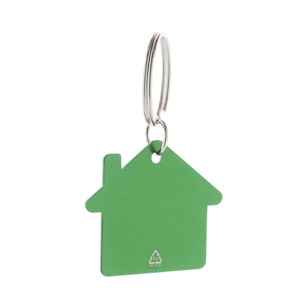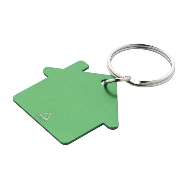 Brelok w kształcie domu, wykonany z recyklingowanego aluminium, z metalowym kółkiem.