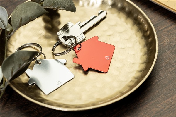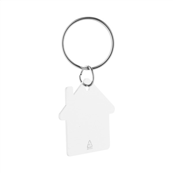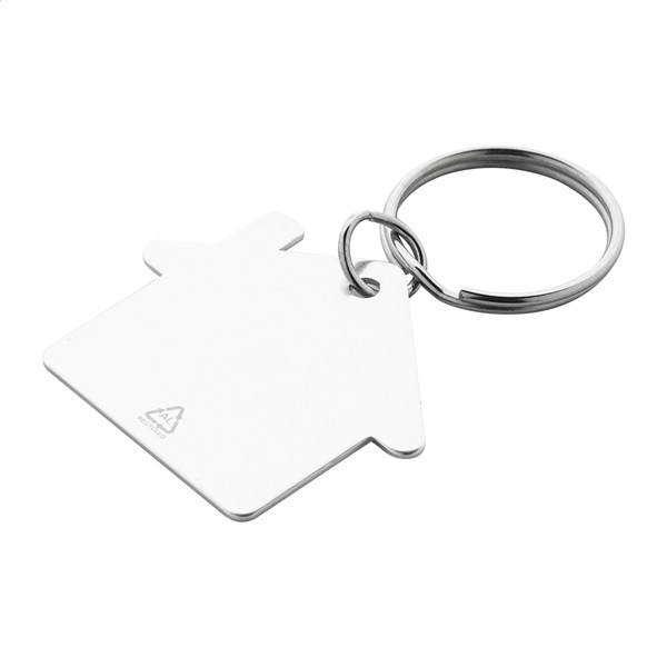 Brelok w kształcie domu, wykonany z recyklingowanego aluminium, z metalowym kółkiem.