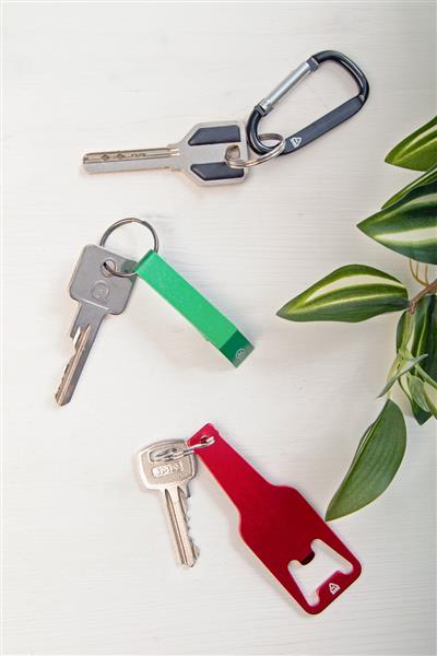 Karabińczyk z aluminium pochodzącego z recyklingu z metalowym kółkiem na klucze.