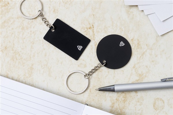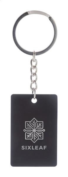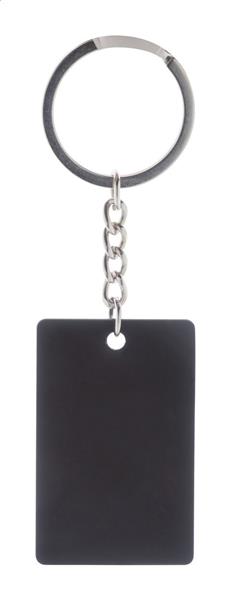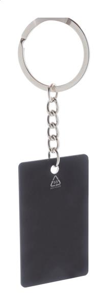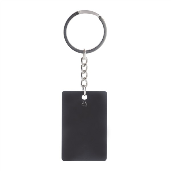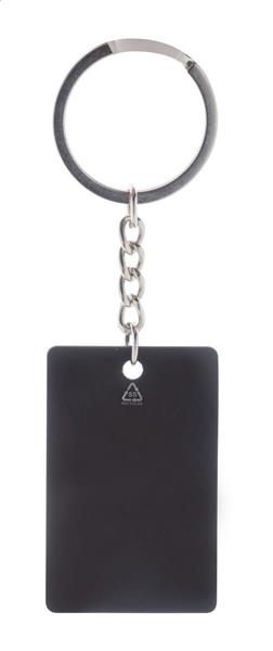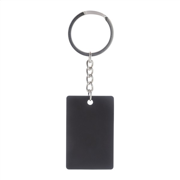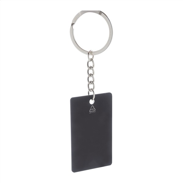 Brelok w kształcie prostokąta, ze stali nierdzewnej z recyklingu z gumowanym wykończeniem. Ze specjalną powłoką do grawera lustrzanego.