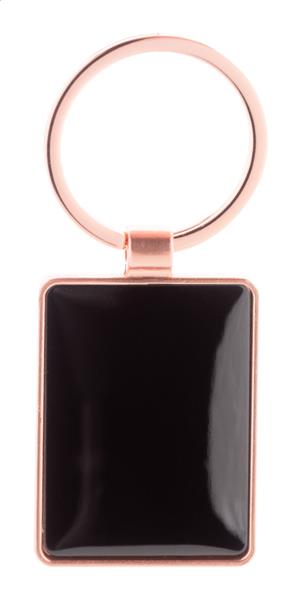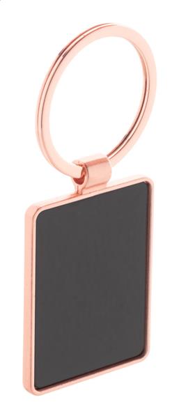 Prostokątny metalowy brelok do kluczy w złotym wykończeniu z brązową blaszką. W pudełku z papieru kraft.