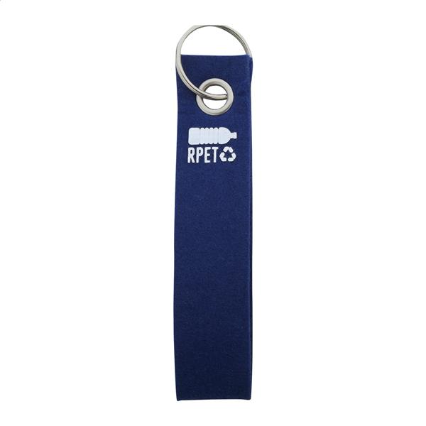 Brelok filcowy RPET z metalowym kółkiem. Z charakterystycznym logo RPET.