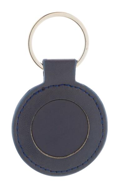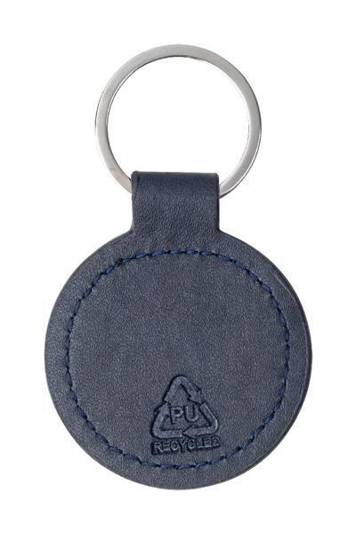Okrągły brelok z recyklingowanej skóry PU z metalowym kółkiem i stalową płytką z logo, z gumowanym wykończeniem. Ze specjalną powłoką do lustrzanego grawerowania laserowego.