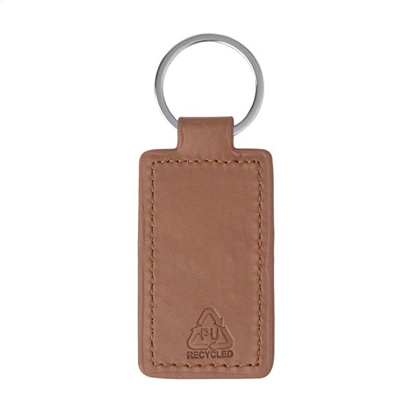 Prostokątny brelok z recyklingowanej skóry PU z metalowym kółkiem i stalową płytką z logo, z gumowanym wykończeniem. Ze specjalną powłoką do lustrzanego grawerowania laserowego.