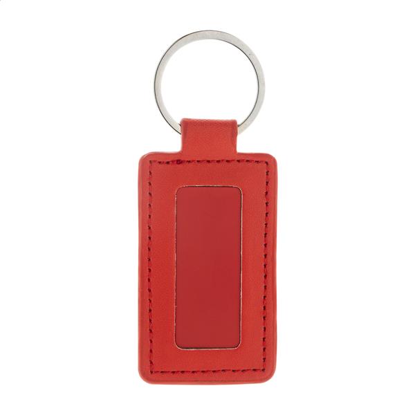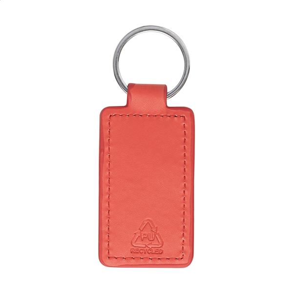 Prostokątny brelok z recyklingowanej skóry PU z metalowym kółkiem i stalową płytką z logo, z gumowanym wykończeniem. Ze specjalną powłoką do lustrzanego grawerowania laserowego.