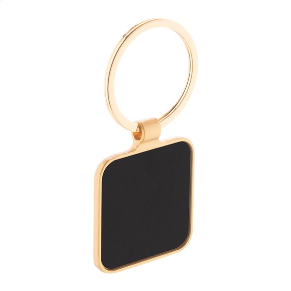Kwadratowy metalowy brelok do kluczy w złotym wykończeniu z brązową płytką. W pudełku z papieru kraft.
