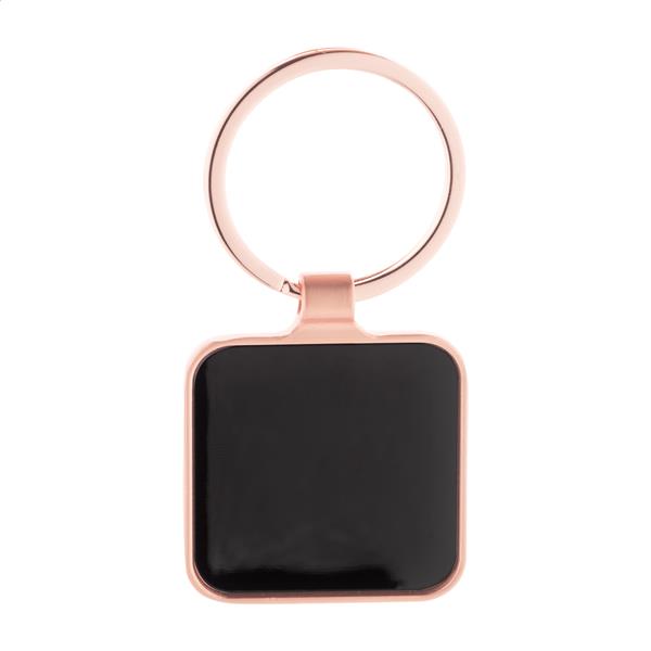 Kwadratowy metalowy brelok do kluczy w złotym wykończeniu z brązową płytką. W pudełku z papieru kraft.