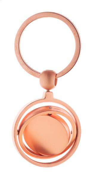 Metalowy brelok do kluczy w złotym wykończeniu z obrotową częścią wewnętrzną. W pudełku z papieru kraft. Description: Metalowy brelok do kluczy w złotym wykończeniu z obrotową częścią wewnętrzną. W pudełku z papieru kraft. Primary Color: róża Material 1: Metal Rozmiar: o35×4 mm