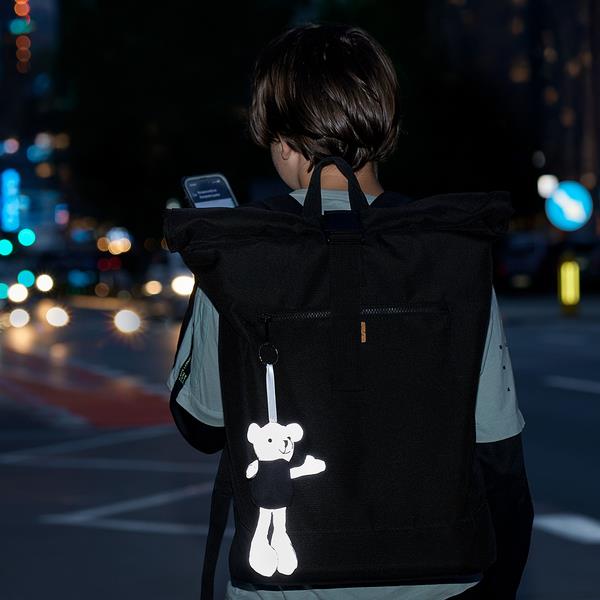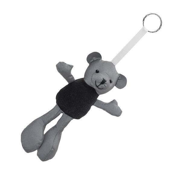 Ręcznie szyty brelok „miś” w koszulce. Wykonany z materiału odbijającego światło.