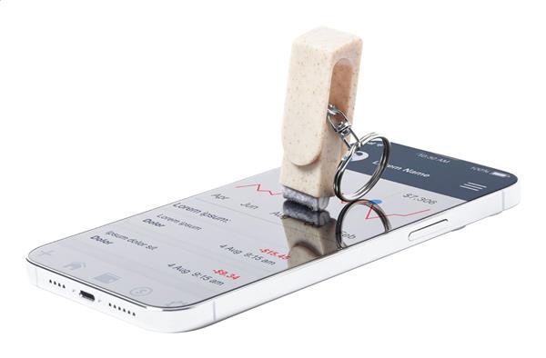 Uchwyt na telefon z ekologicznego plastiku ze słomy pszenicznej z czyścikiem do ekranu i metalowym kółkiem na klucze.
