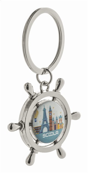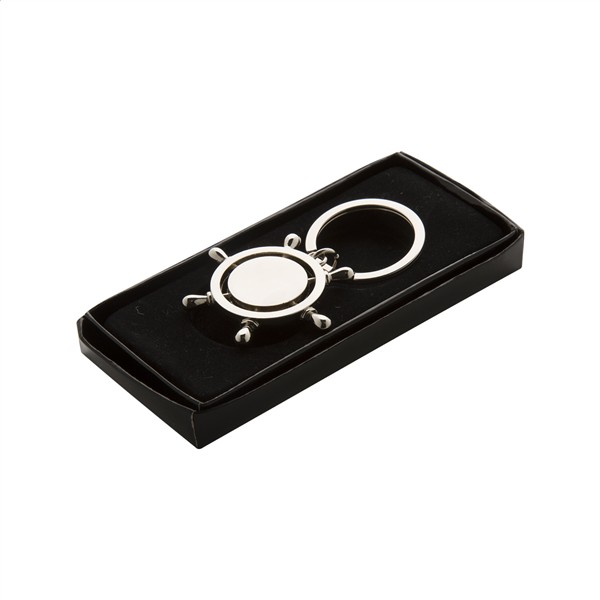 Brelok o kształcie koła sterowego w czarnym opakowaniu prezentowym.