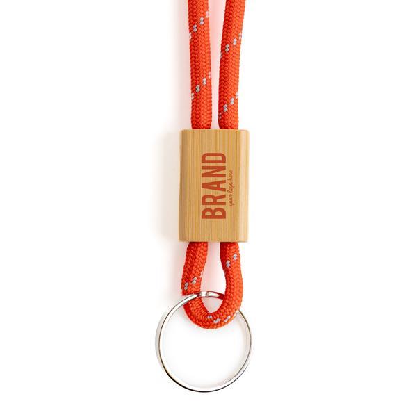 Brelok sznurkowy, regulowany z kółkiem i bambusowym detalem wykonany z poliestru. Dodaj swoje logo, slogan lub unikalny projekt, aby stworzyć wyjątkowy produkt odzwierciedlający tożsamość Twojej marki.