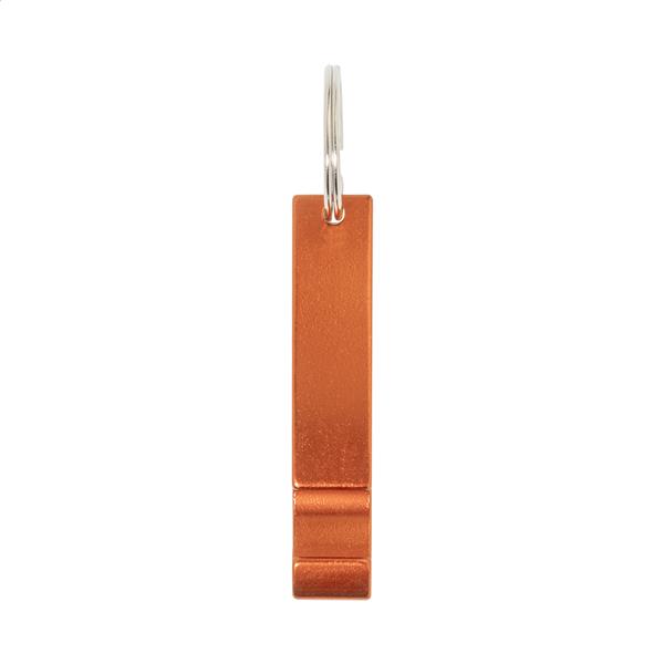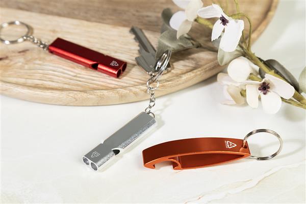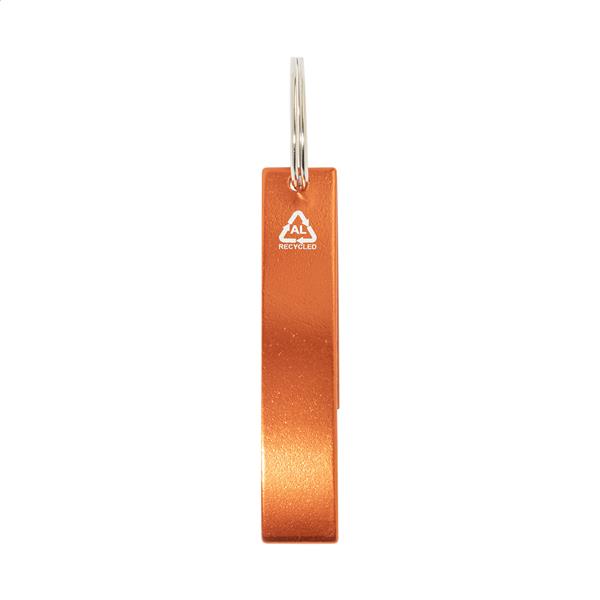 Otwieracz do butelek wykonany z recyklingowanego aluminium z metalowym brelokiem.
