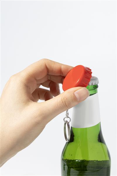 Brelok w kształcie kapsla z otwieraczem do butelek, wykonany z recyklingowanego tworzywa ABS. Primary Color: czerwony Material 1: Plastik (ABS) Rozmiar: 40×45×12 mm