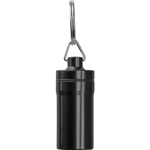 Brelok pojemnik z zewnętrzną powłoką ze stali nierdzewnej oraz wnętrzem z tworzywa sztucznego. Idealny do bezpiecznego przechowywania drobnych przedmiotów w podróży.