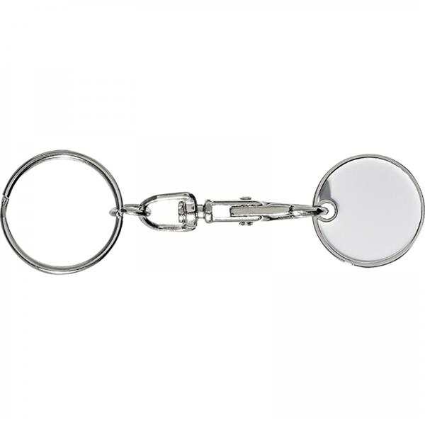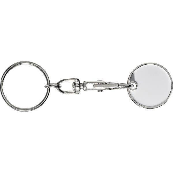 Metalowy brelok z karabińczykiem i żetonem do wózka na zakupy.