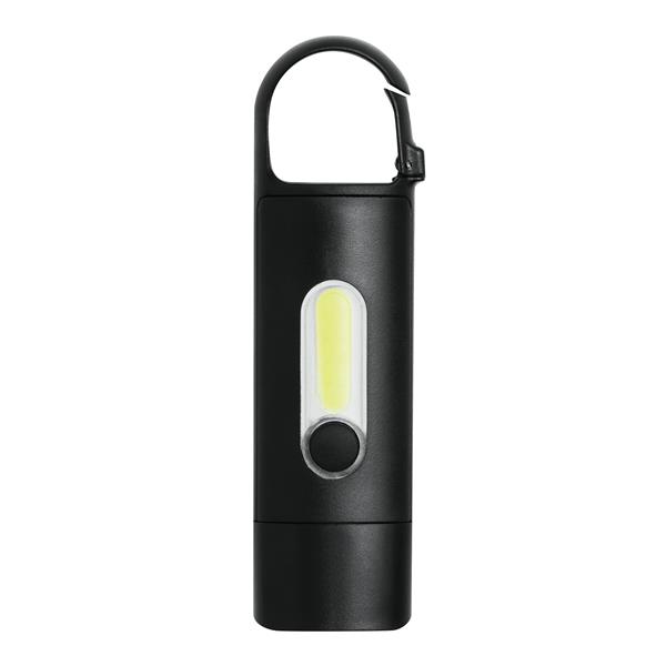 Akumulatorowa latarka BRIGHT LIGHT. Przednia dioda LED ma 3 tryby świecenia (100%, 75% oraz miganie). Latarka posiada pole świetlne z 10 mocnymi diodami LED na górnej powierzchni, mocną baterię litową (200 mAh) i wyłącznikiem/włącznikiem. W zestawie jest także kabel USB do ładowania ze złączem typu C (ok. 30 cm) oraz karabińczyk (NIE nadaje się on do wspinaczki). Zapakowana jest w pudełko.