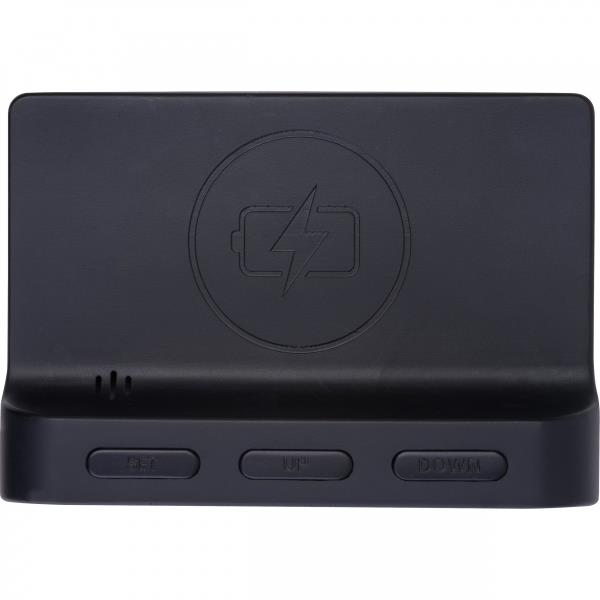 Budzik z lustrzanym wyświetlaczem i funkcją bezprzewodowego ładowania. Zegar ma wyświetlacz czasu (12h/24h), wyświetlacz daty, funkcję alarmu i wyświetlacz temperatury (°C/°F). W zestawie kabel ładujący USB-A do USB-C.