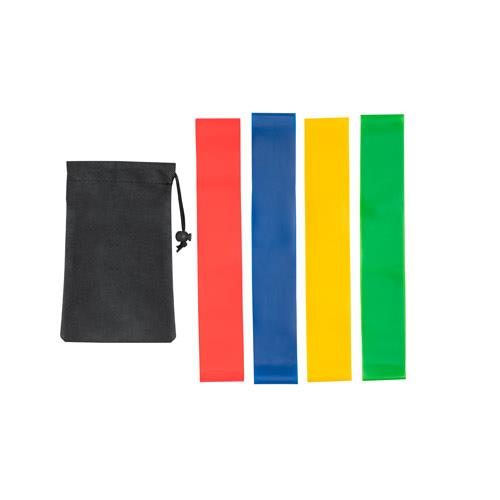 Zestaw 4 taśm fitness dostarczany w czarnym etui non-woven. Różne poziomy oporu: Czerwona -wysoki, Żółta – średni, Niebieska – niski, Zielona – bardzo niski. Etui: 100 x 200 mm