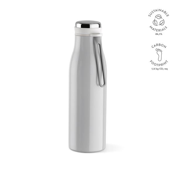 Nasza butelka z recyklingowanej stali nierdzewnej o pojemności 495 ml (470 ml netto) to małe cudo o dużym znaczeniu, wykonane z recyklingowanej stali nierdzewnej i nieprzeciekające. Ponadto konstrukcja z podwójnymi ściankami zapewnia idealną temperaturę napojów.
