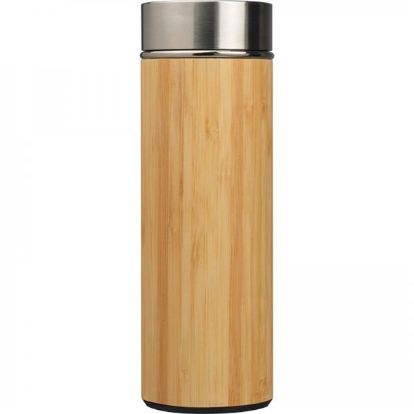 Butelka wykonana ze stali nierdzewnej w bambusowej obudowie, z sitkiem na herbatę. Pojemność 350 ml.
