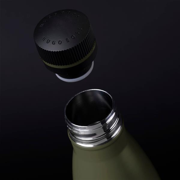 Butelka wielokrotnego użytku Gear Matrix łączy w sobie nowoczesność i styl. Stworzona do przechowywania zarówno gorących, jak i zimnych napojów, o dynamicznym designie i znakomitych detalach, które nawiązują do linii Gear Matrix. Dostępna w kolorze niebieskim, czerwonym, khaki, żółtym, czarnym i srebrnym. Silikonowa podstawa butelki z ABS jest wykonana z lekkiej amortyzacji, która pomaga chronić powierzchnię i zmniejsza hałas podczas odkładania. To butelka stworzona do łatwego noszenia. Hermetyczna silikonowa nakrętka z ABS z wbudowanym logo HUGO BOSS utrzymuje napój gorący lub zimny przez około 16 godzin. Dwuścienna konstrukcja butelki wzmacnia jej korpus ze stali nierdzewnej, a dodatkowa warstwa miedziowanej wyściółki zapobiega niepożądanemu przenoszeniu ciepła. Butelka Gear Matrix ma pojemność 500 ml. Jest wielokrotnego użytku, wykonana ze stali nierdzewnej 304, z silikonową nasadką i dnem ABS.
