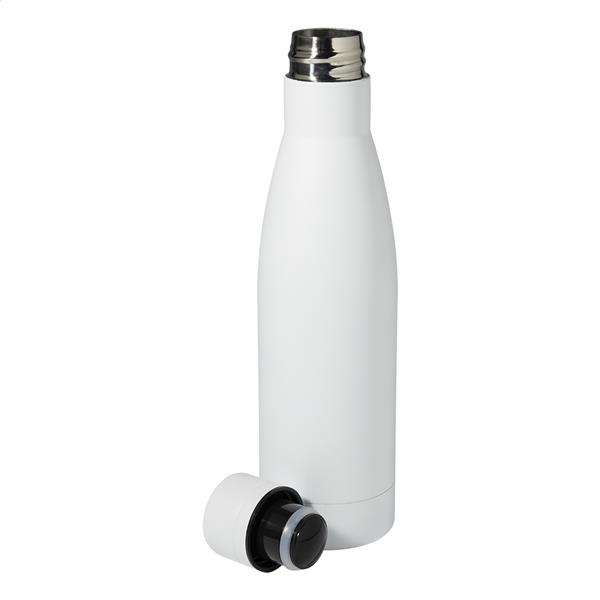 Butelka próżniowa o podwójnych ściankach ze stali nierdzewnej, izolowana miedzią, 500 ml. Izolacja miedziana utrzymuje temperaturę napojów gorących przez 12 godzin i zimnych przez 24 godziny.