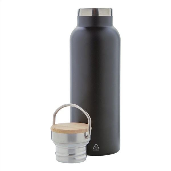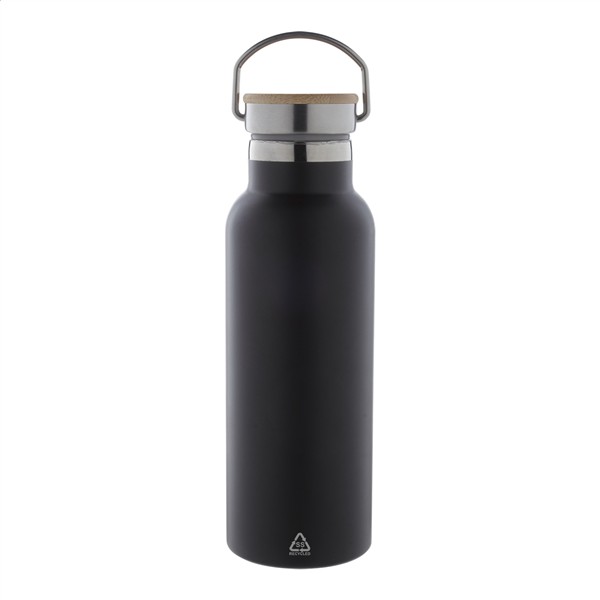 Butelka próżniowa o podwójnych ściankach, wykonana ze stali nierdzewnej pochodzącej z recyklingu, z bambusową pokrywką. 500ml.