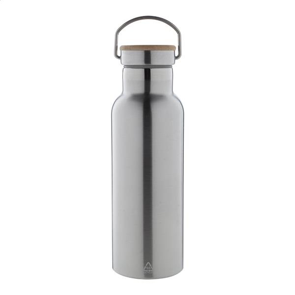 Butelka próżniowa o podwójnych ściankach, wykonana ze stali nierdzewnej pochodzącej z recyklingu, z bambusową pokrywką. 500ml.