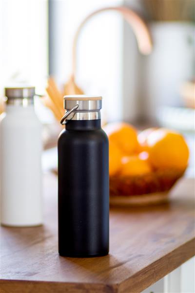 Butelka ze stali nierdzewnej o podwójnych ściankach, izolowana próżniowo, z bambusową pokrywką. 500 ml