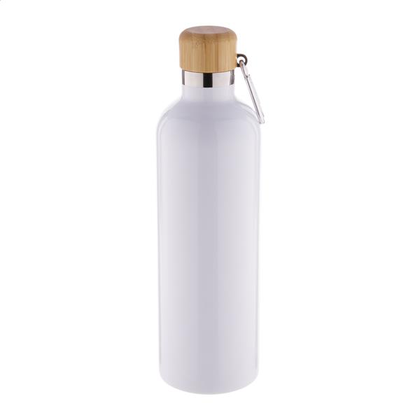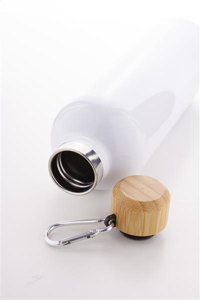 Butelka ze stali nierdzewnej o podwójnych ściankach, izolowana próżniowo, z bambusową nakrętką i karabińczykiem, 500 ml.