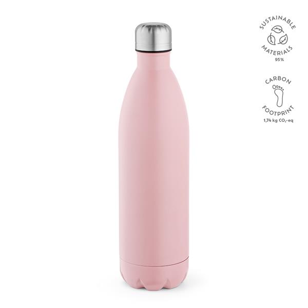 Butelka z recyklingowanej stali nierdzewnej o pojemności 1100 ml (1070 ml netto) jest matowa. Jest przyjazna dla środowiska i można ją myć w zmywarce. Jej szczelna konstrukcja zapewnia brak zmartwień, a podwójne ścianki gwarantują odpowiednią temperaturę napojów.