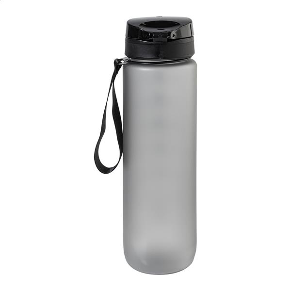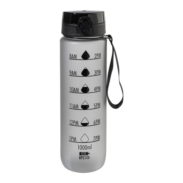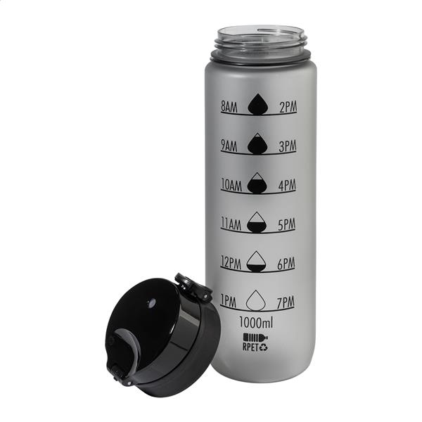 Matowa butelka sportowa z tworzywa RPET z motywującym oznaczeniem objętości i czasu, z automatycznie otwieraną klapką z blokadą bezpieczeństwa i paskiem do noszenia. Pojemność 1000 ml. Bez BPA. Nie nadaje się do napojów gazowanych.
