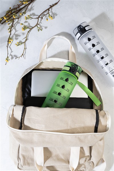 Matowa butelka sportowa z tworzywa RPET z motywującym oznaczeniem objętości i czasu, z automatycznie otwieraną klapką z blokadą bezpieczeństwa i paskiem do noszenia. Pojemność 1000 ml. Bez BPA. Nie nadaje się do napojów gazowanych.