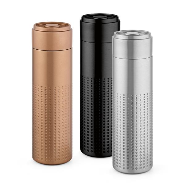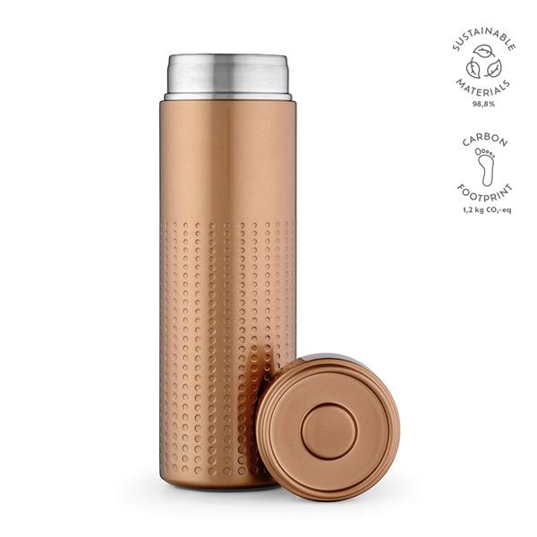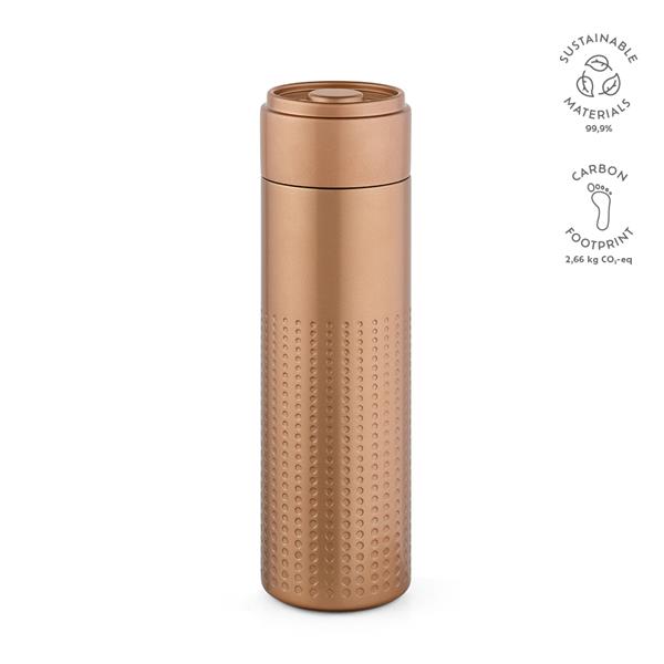 Odkryj na nowo zrównoważony rozwój dzięki naszej butelce z recyklingowanej stali nierdzewnej o pojemności 540 ml (500 ml netto). Podwójne ścianki są ozdobione unikalnym wzorem. Wykonana ze stali nierdzewnej pochodzącej z recyklingu, jest świadomym ekologicznie wyborem, który zapewnia orzeźwienie.