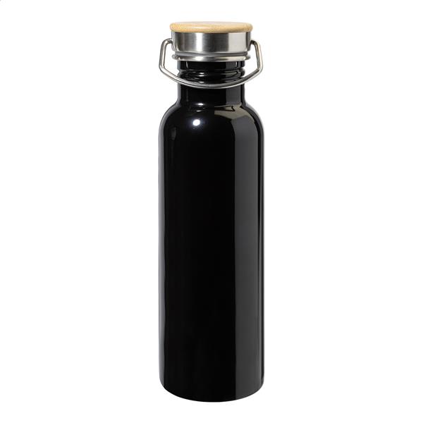Butelka ze stali nierdzewnej z recyklingu, z bambusową pokrywką, 750 ml. Primary Color: czarny Pojemność: 750 ml Material 2: Bambus Material 1: Stal nierdzewna z recyklingu Rozmiar: o69×252 mm Można używać w kuchence mikrofalowej: Nie Można myć w zmywarce: Nie Szczelny / Odporny na zalanie: Szczelny