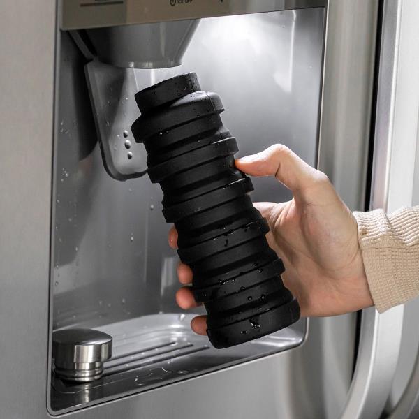 Silikonowa butelka, o pojemności 500 ml, którą po opróżnieniu zawartości można złożyć w kompaktową harmonijkę.