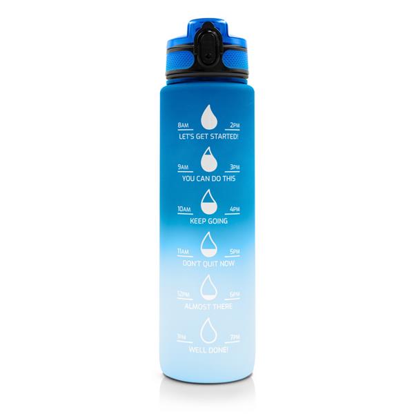 Butelka motywacyjna 1000 ml Air Gifts, skala ml z jednej strony i podziałka motywacyjna z drugiej strony, zamknięcie z blokadą, pasek na rękę (pakowany oddzielnie), gumowane wykończenie, przeznaczona wyłącznie do zimnych i niegazowanych napojów