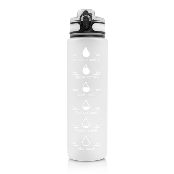 Butelka motywacyjna 1000 ml, skala ml z jednej strony i podziałka motywacyjna z drugiej strony, zamknięcie z blokadą, pasek na rękę (pakowany oddzielnie), gumowane wykończenie, przeznaczona wyłącznie do zimnych i niegazowanych napojów