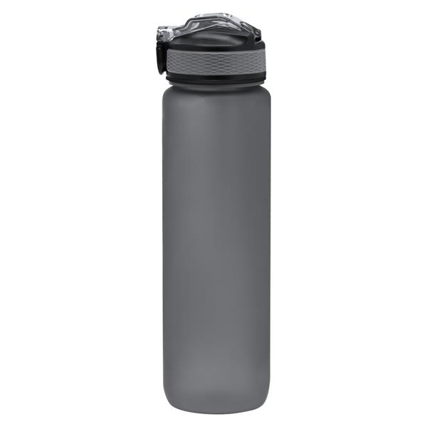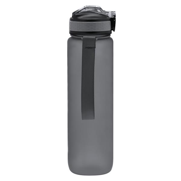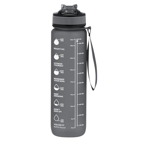 Butelka sportowa 1000 ml ze skalą w litrach i uncjach oraz miarką motywacyjną, zamknięcie z blokadą, uchwyt ułatwiający noszenie, półprzezroczyste, matowe wykończenie, produkt wykonany z PETG