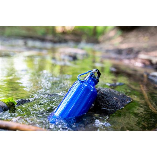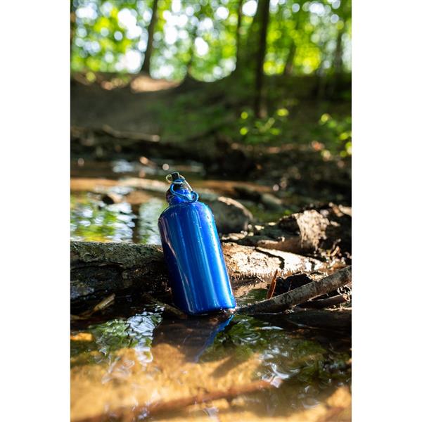 Butelka sportowa 500 ml z dopasowanym kolorystycznie karabińczykiem umożliwiającym przypinanie, zalecana wyłącznie do zimnej wody, błyszczące wykończenie, produkt wykonany z aluminium i plastiku