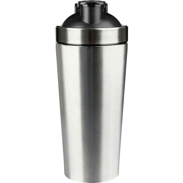 Butelka sportowa 750 ml z pojedynczą ścianką ze stali nierdzewnej 304, shaker, zakręcane wieczko, metalowa kulka ułatwiająca mieszanie składników, ikona recyklingu na produkcie, zapakowana w kartonik kraftowy