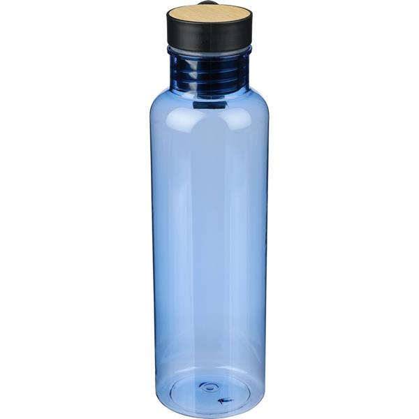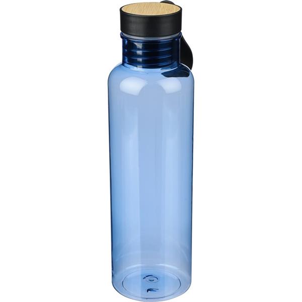 Butelka sportowa 750 ml, ozdobiona bambusowym detalem na górze, silikonowy pasek do przenoszenia, nie nadaje się do mycia w zmywarce, indywidualnie zapakowana w torebkę foliową z recyklingu, produkt wykonany z RPET, nakrętka z PP