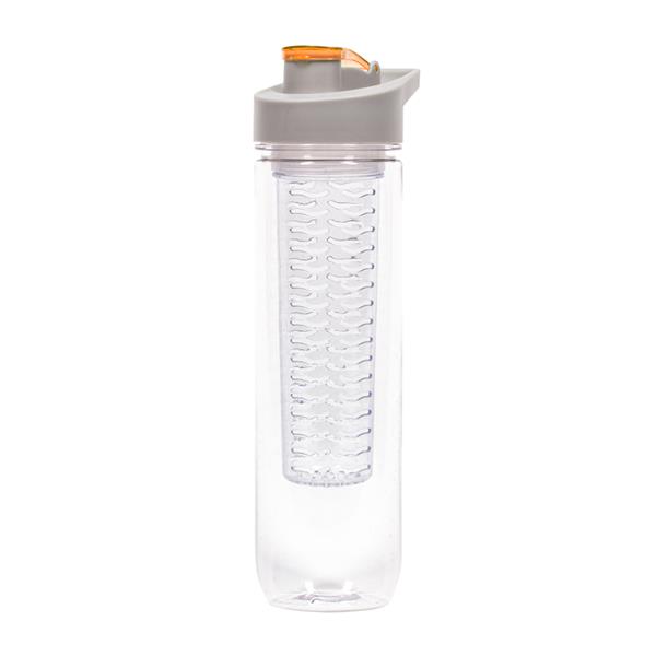 Butelka sportowa 800 ml Air Gifts, posiada pojemnik na lód lub owoce umożliwiający nadanie wodzie smaku według własnych preferencji, szara zakrętka z uchwytem ułatwiającym noszenie i kolorowym zamknięciem, butelka przeznaczona wyłącznie do zimnych i niegazowanych napojów, produkt wykonany z Tritanu i PP