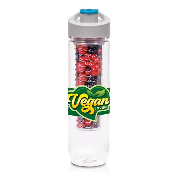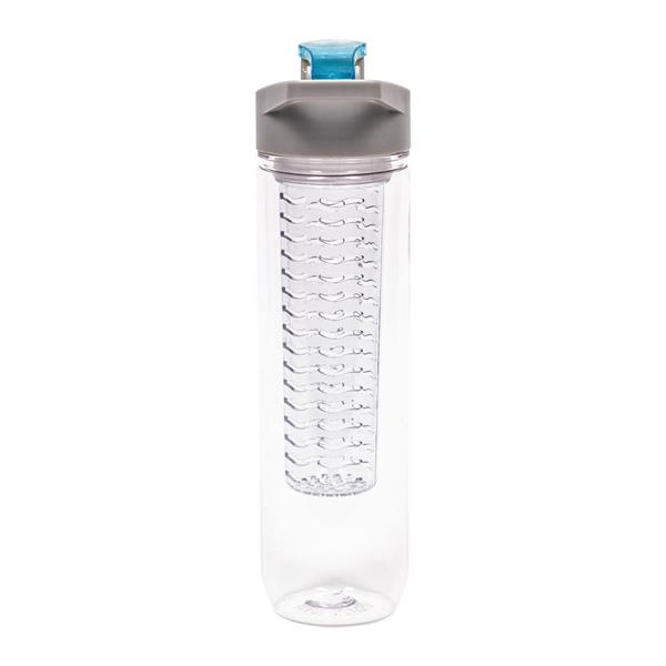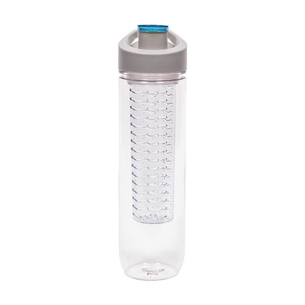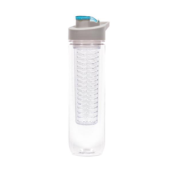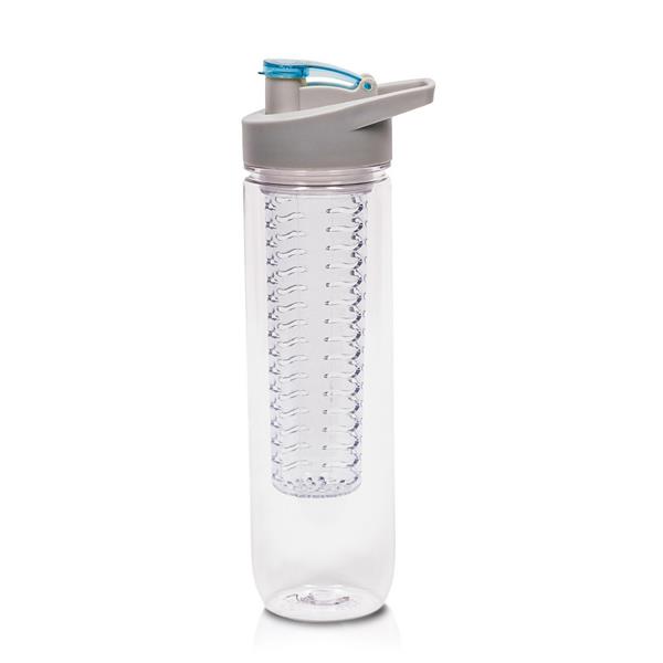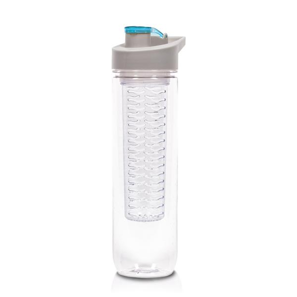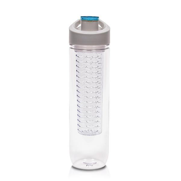 Butelka sportowa 800 ml Air Gifts, posiada pojemnik na lód lub owoce umożliwiający nadanie wodzie smaku według własnych preferencji, szara zakrętka z uchwytem ułatwiającym noszenie i kolorowym zamknięciem, butelka przeznaczona wyłącznie do zimnych i niegazowanych napojów, produkt wykonany z Tritanu i PP