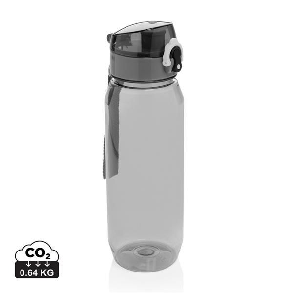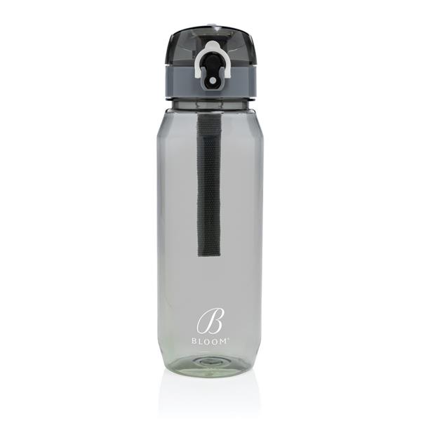 Butelka sportowa 800 ml, uchwyt, wykonana z RPET, nie wymaga obsługi oburącz, całkowita zawartość materiałów z recyklingu obliczona na podstawie wagi całkowitej przedmiotu: 73%, wyłącznie mycie ręczne, zalecana wyłącznie do zimnej wody, w pudełku z papieru kraftowego