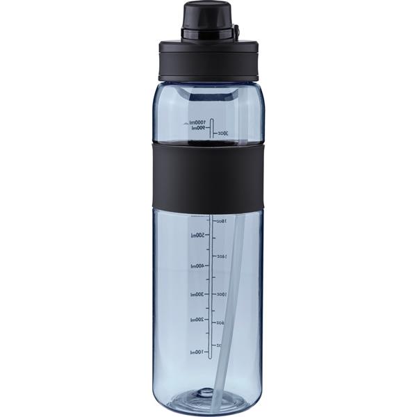 Butelka sportowa 900 ml z tritanu, ustnik i odkręcane wieczko, silikonowy pierścień, uchwyt ułatwiający noszenie, miarka z boku, zapakowana w kartonową wytłoczkę