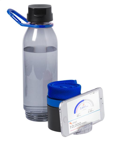 Plastikowa wielofunkcyjna butelka sportowa z ręcznikiem chłodzącym (390 g/m2) w dolnej komorze i wysuwanym uchwytem na telefon komórkowy. W pudełku upominkowym. 650 ml. Nie nadaje się do napojów gazowanych.