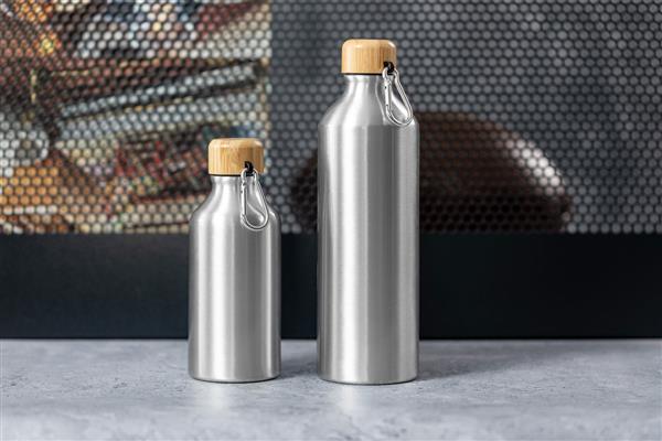 Aluminiowa butelka sportowa z bambusową pokrywką i karabińczykiem, 400 ml. Nie nadaje się do napojów gazowanych.
